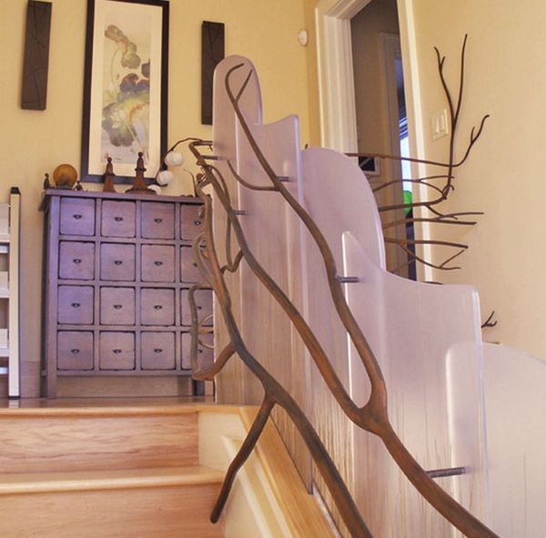 Mang thiên nhiên vào không gian sống bằng cách sử dụng một cây khô có nhánh để làm tay vịn cầu thang.