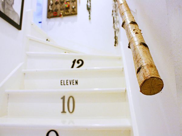 Cầu thang màu trắng có đánh số bậc kết hợp với tay vịn làm từ một nhánh cây bạch dương.
