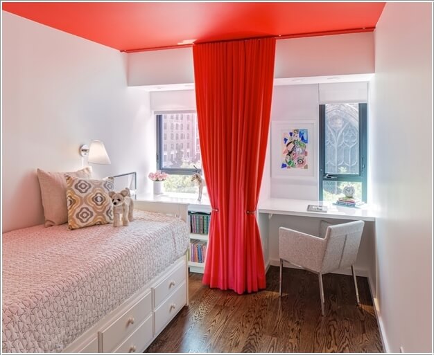 Thay vì mở rộng màu trắng trên bức tường lên đến trần nhà, bạn có thể sơn trần nhà bằng một màu đậm. Thêm tấm rèm cửa cùng màu nơi cửa sổ, sự chú ý sẽ chuyển sang trần nhà và kích thước nhỏ của căn phòng sẽ ít được thấy.
