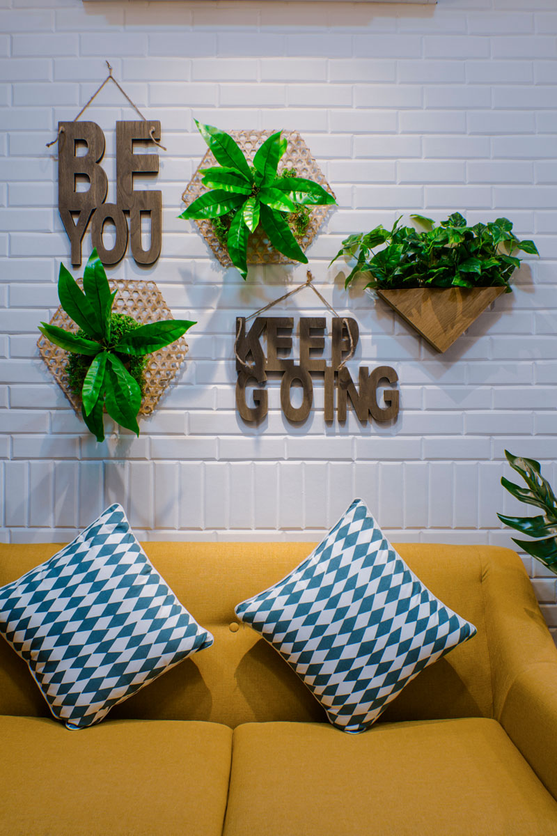 Phòng khách thiết kế nhỏ gọn được trang trí nổi bật với sofa đôi vàng kết hợp với tường gạch sơn trắng ghép nối, điểm xuyến là những chậu cây xanh khiến không gian thật tươi mới và gần gũi.