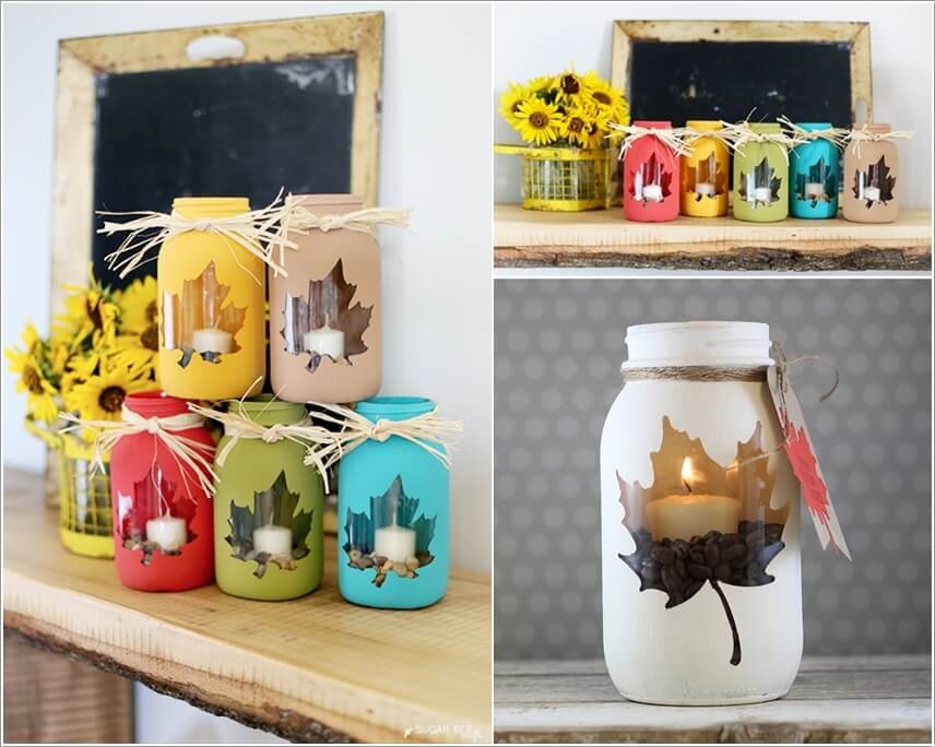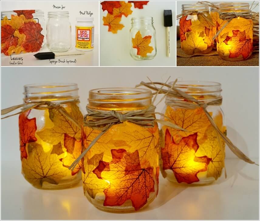 Sử dụng bình thủy tinh với những chiếc là mùa thu, thêm ánh nến cho không khí lãng mạn, ấm áp.