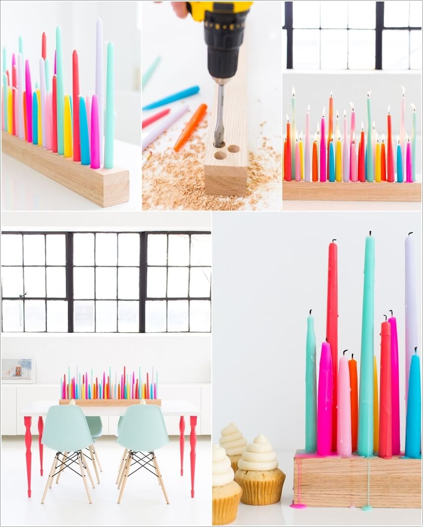 Bạn cũng có thể sử dụng thanh gỗ, khoan lỗ tạo đế nến màu sắc chắc chắn.