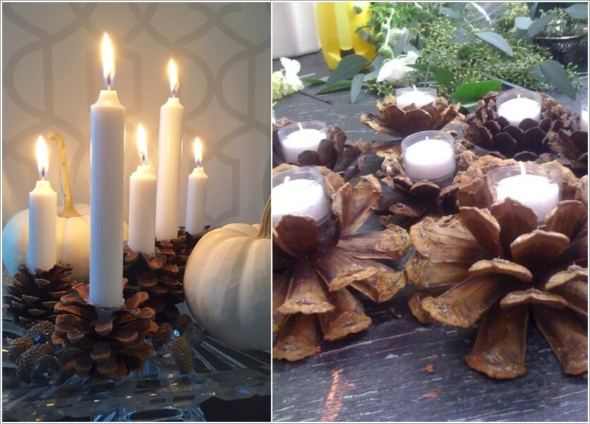 Những trái thông khô được sử dụng làm đế đựng nến. Chút ánh sáng dịu nhẹ từ nến và mùi thơm của gỗ thông sẽ giúp bạn thư giãn tinh thần sau những giờ học tập hay làm việc mệt mỏi.