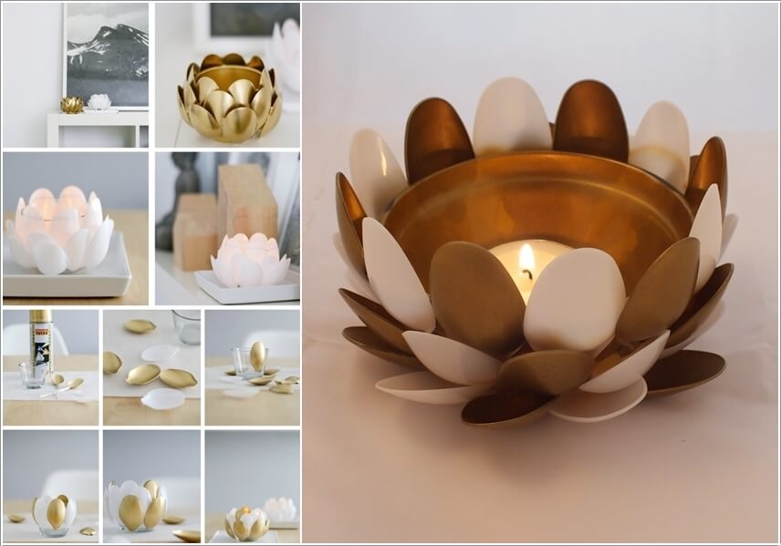 Tái sử dụng những chiếc thìa nhựa, sơn trang trí và ghép thành hình theo sự sáng tạo của bạn, những đế nến độc đáo góp phần tạo điểm nhấn cho căn phòng.