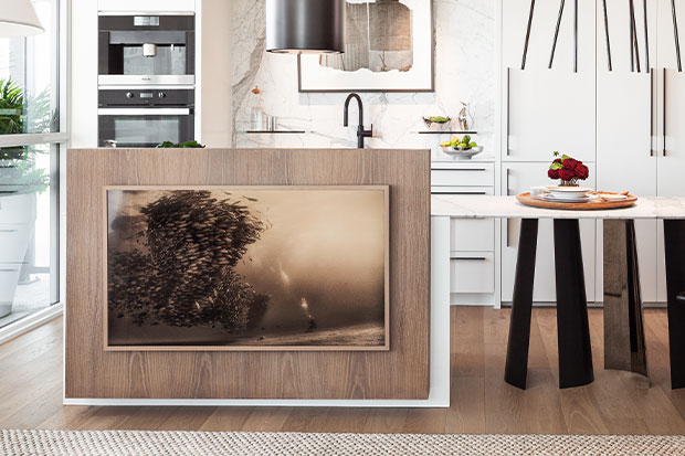 – Tận dụng đảo bếp đa năng: Trong nhà bếp nhỏ, đảo bếp được thiết kế để phục vụ ba chức năng: khu vực nấu nướng, nơi ăn uống và giá đỡ TV.