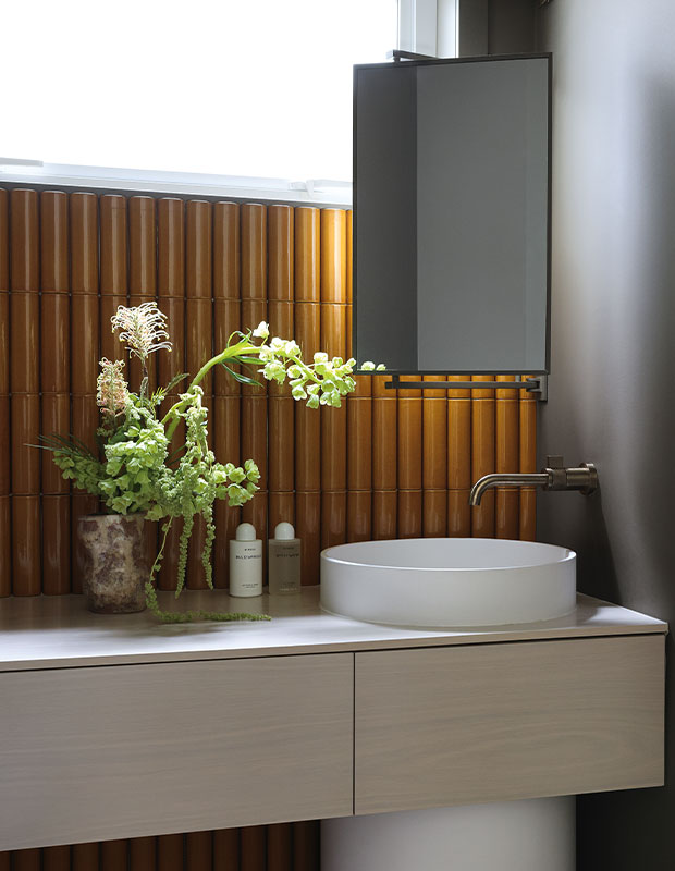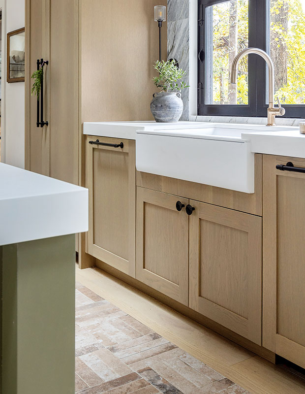 – Lối đi bằng gạch trong bếp: Ở những khu vực di chuyển nhiều như trước bồn rửa, hãy sử dụng gạch lát như một “đường chạy” bền bỉ và dễ vệ sinh. Gạch được lát ngang bằng với sàn, tạo sự chuyển tiếp liền mạch.