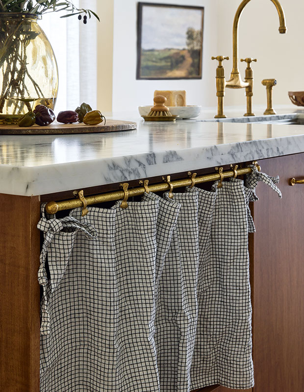 – Rèm vải thay vì cửa gỗ: Thay cửa tủ gỗ thông thường bằng rèm vải họa tiết để tạo điểm nhấn. Đây là ý tưởng hoàn hảo cho các thiết bị được sử dụng thường xuyên như lò vi sóng.