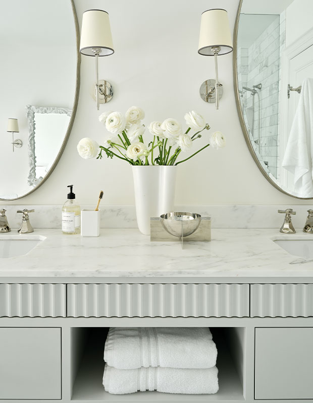 – Chừa khoảng trống để khăn tắm: Tủ bàn trang điểm có thể được thiết kế với nhiều kiểu cửa khác nhau. Khu vực giữa để trống như một kệ mở để xếp khăn tắm, trong khi các ngăn kéo khác có thể chứa máy sấy tóc và dụng cụ trong phòng tắm.